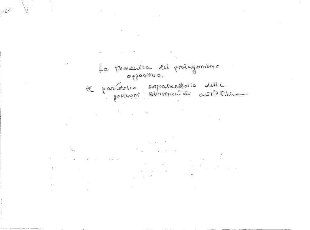 Sono rimasto seduto per un tempo – ciò che io richiamo esser lungo – facendomi sbandierare dalle folate ventose parolifere di coetanei, anziani, adulti, corpi, labbra in movimento. Una sostantivizzazione di qualsiasi esistente edificio verbale umano in un arco d’ore esageratamente illuminante. Con un’ironia del quale non mi gratifico, ho avuto modo di estrapolare dalla vita analitica del mio modesto organo cerebrale centrale un nuovo e banal maniero con cui investire il trascorrere dell’idee a gene in nulla. In fiacche parole, un modo per perder tempo per giorni alterni. Il mio ha il nome di un progetto sconsolato ideo-fotocinematografico, dal titolo “La computazione del protagonismo oppositivo. Il paradosso soprasseduto delle posizioni schieraméntali antitetiche“.
